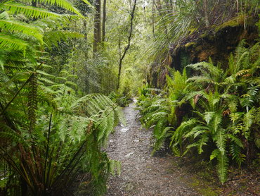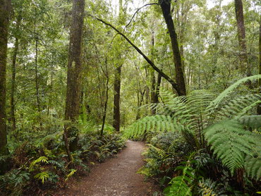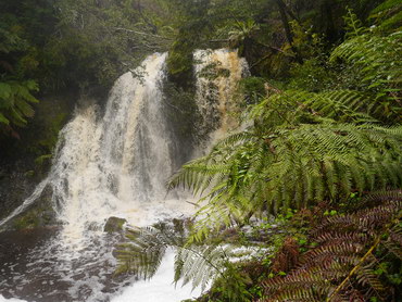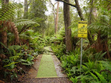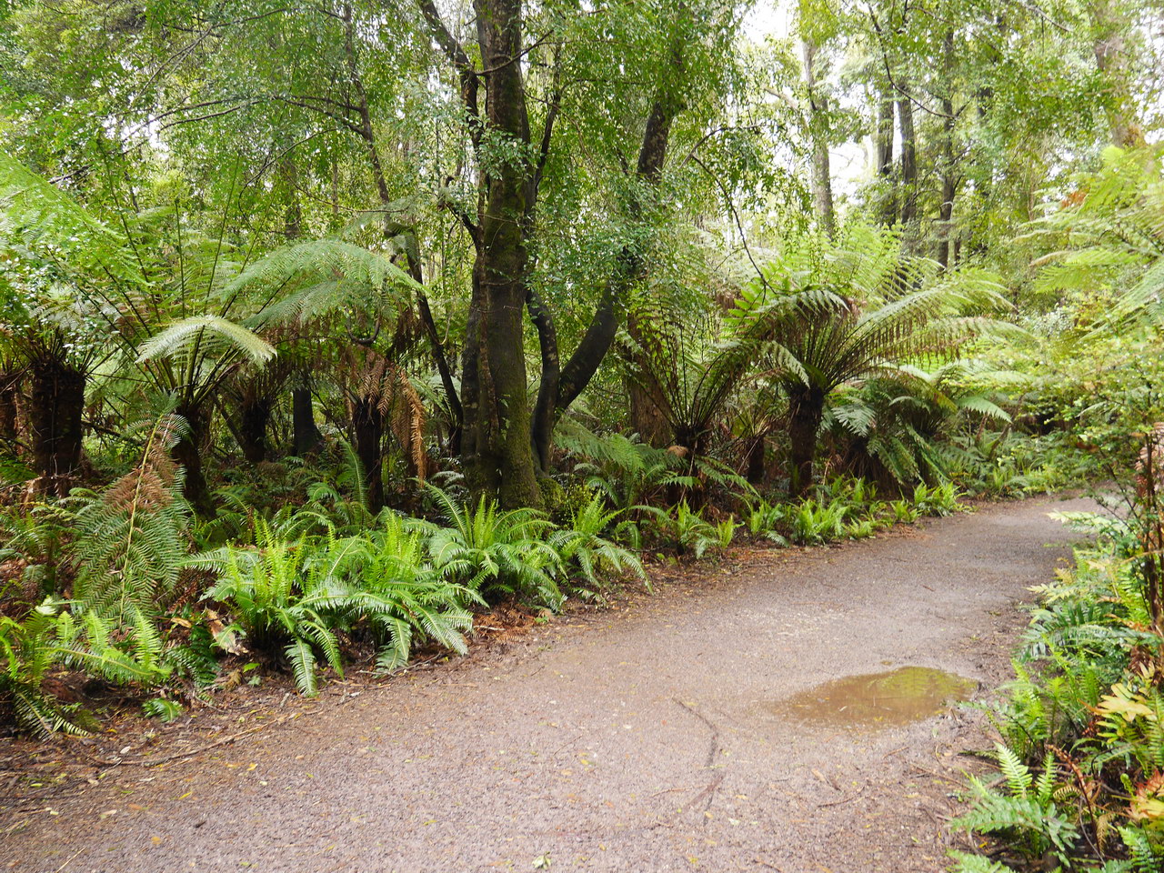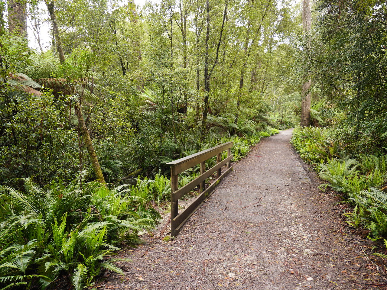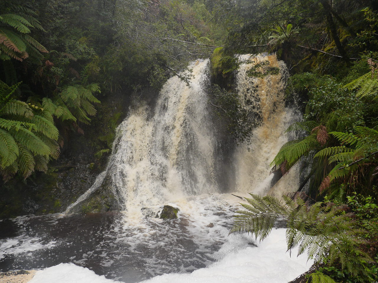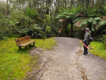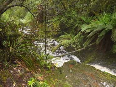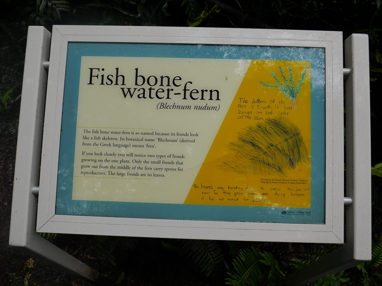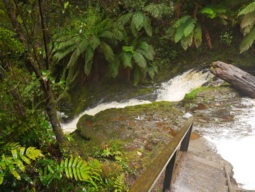 | It was an overcast day, with showers coming and going. But we were here so we may as well go for a walk. The car park was great if you didn't have a caravan in tow, so we had to park outside and walk a short distance to the gate. The facilities looked good and the usual sign denoted the start of the walk. The path was well made and flat with boardwalks in the wet areas. The boardwalks even had faux grass on them perhaps for safety and certainly for aesthetics. There were quite a few signs denoting the various history aspects and plant species. The falls themselves were roaring with mist blanketing the area making getting a good photograph near impossible due to water on the lens. As usual you retrace your steps back to the start. This time we noticed an orchid on the way. How did we miss it going in! Easily I would say. |