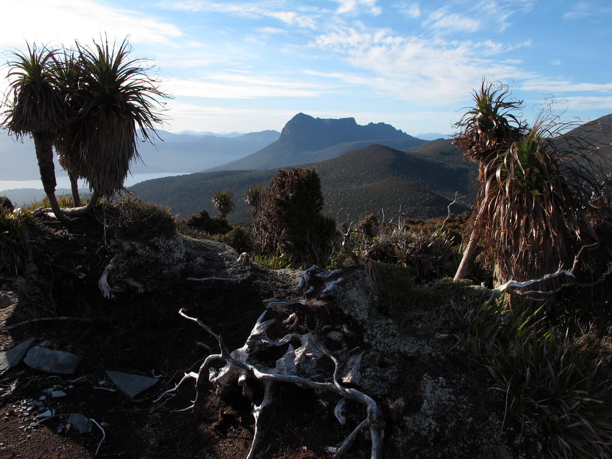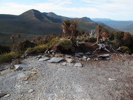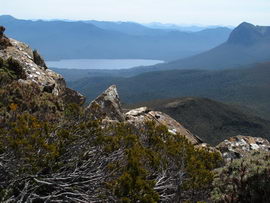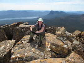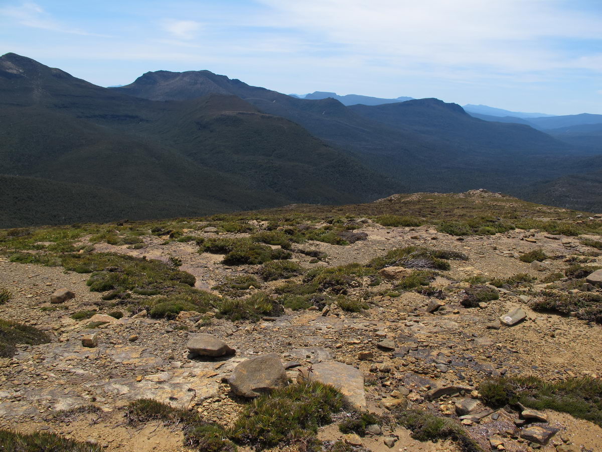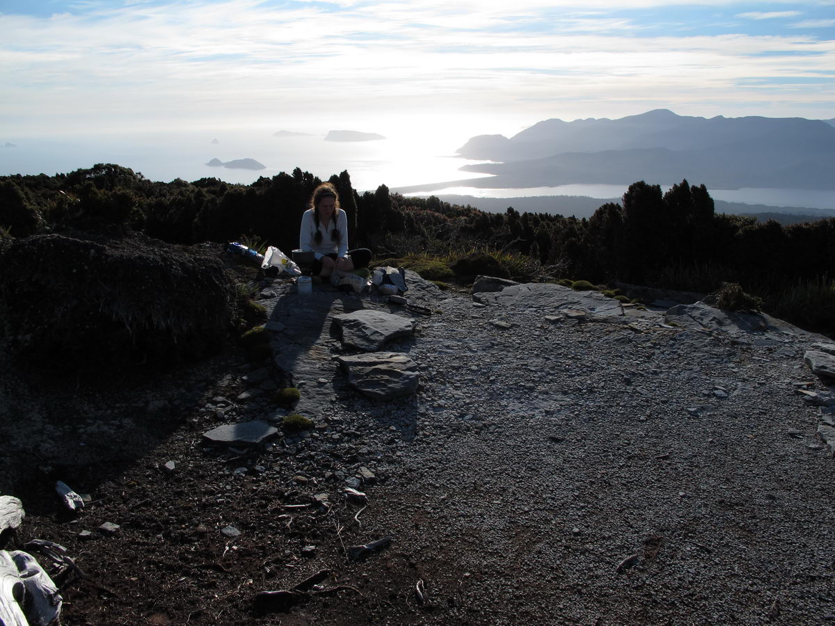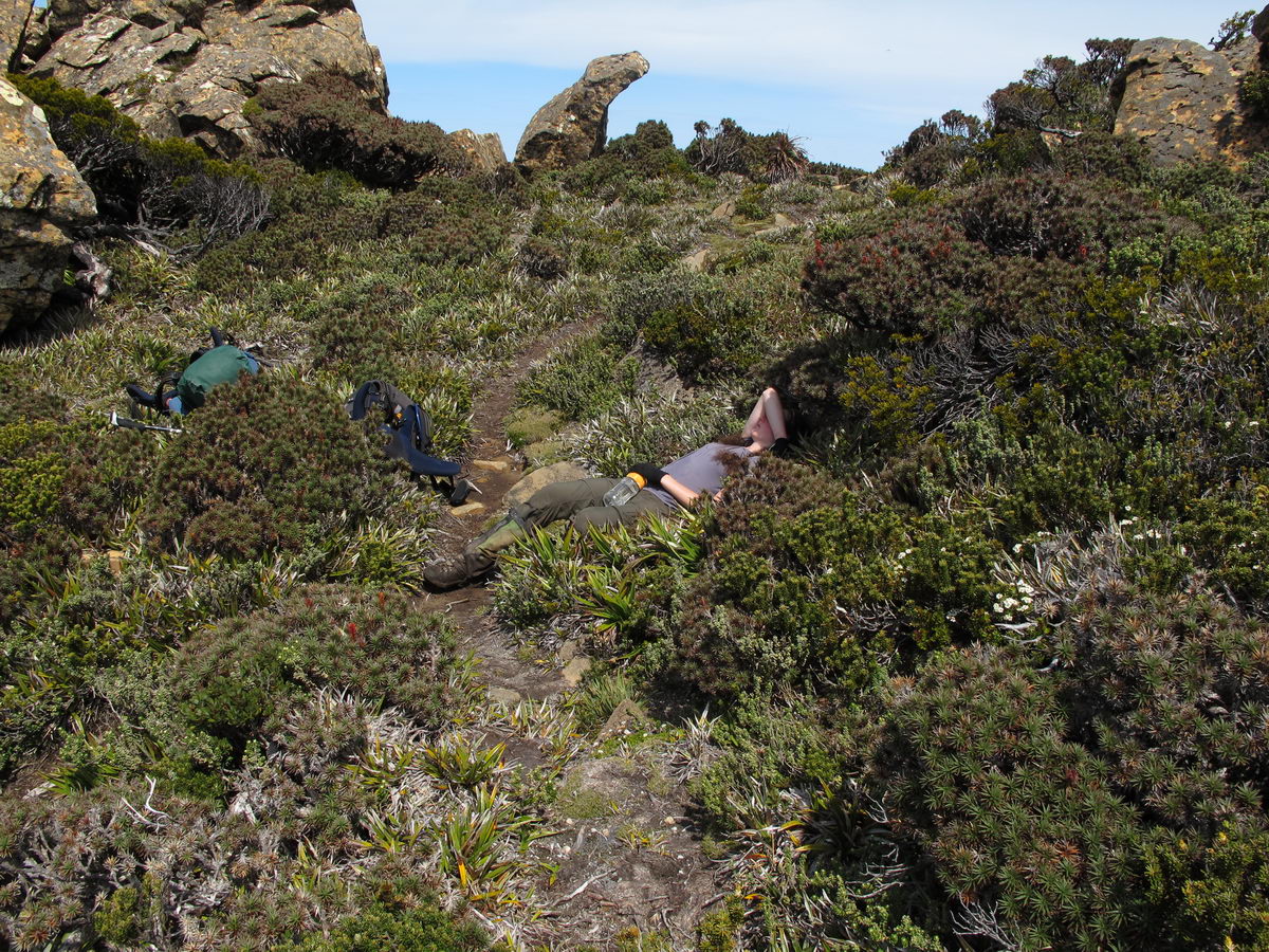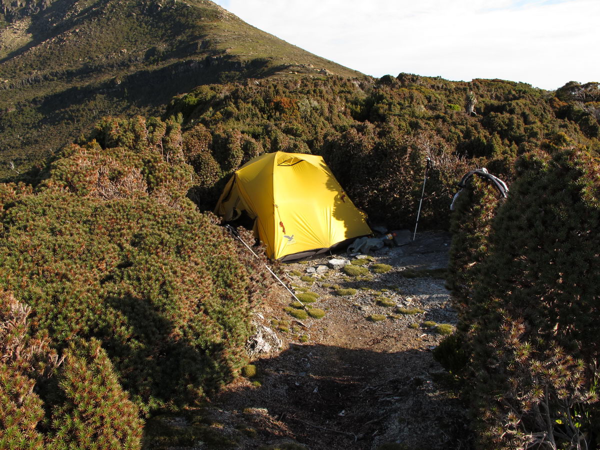 Susan's Diary: Hill One and Hill Two Saddle to Pandani Knob Tuesday 15 December 8:00 – 17:00 We got up at 6am for an 8am start. The wind was blowing quite strongly making for a cold morning, so we began in fleeces and beanies. We were hoping to make it to Leaning Tea Tree Saddle today, although not really expecting to, in order to give us a shot of making Precipitous Bluff before the expected rain for Thursday. The walk from Hill Two to Pigsty Ponds was fairly easy with spectacular views of everything – mountains and ocean. We arrived at Pigsty Ponds after 1.5 hours and ran into the son from the day before. As it turns out he re-injured himself the night before when they pushed to make camp at Pigsty Ponds. We had seen his and another tent from Hill Four and incredibly the owner of the other tent knew the son and told him of his attempt at Precipitous Bluff where he got lost for 1.5 hours in the vicinity of Leaning Tea Tree Saddle. He said he climbed a tree to get a bearing to follow back onto the ridge and then decided against continuing on. He warned us not to leave anything on the outside of our packs and to be very careful with the track in the coming days. From Pigsty Ponds there was a tiring climb up past an impressive stone arrow marking the Mt La Peruse turn-off. The track then continued onto Maxwell Ridge. Past this point the track climbs steadily to a rocky ridge, with excellent views over the landscape traversed the day before. On the ridge top we followed erect cairns for easy spectacular walking until we reached the ridge that descended onto King Billy Saddle. The ridge gave more excellent views of the area, in particular Ooze Lake and Pindars Peak, which for the first time was in complete view (the day before you just manage to see its peak). The descent was tiring through mud and narrow corrals. The day was heating up, in the 30s, and from King Billy Saddle to Ooze Lake we had to bash through reasonably dense scrub which had the advantage of providing respite from the sun. At Ooze Lake we stopped for lunch. Given the time was 13:40 when we finished, we didn’t think we would make it to Leaning Tea Tree Saddle so we had to stock up on water again (no reliable water before then), which was unfortunate. I found carrying a very heavy pack very tiring in the sun. Straight after Ooze Lake there is a steady gradual climb up to Pindars Peak, which starts off on the west side and then crosses over to the east side of the range which is sheltered from any potential breezes. This made the climb very long and unpleasant for me in the scorching heat. With much relief we reached the Pindars Peak ascent turn-off after a slow progress 1:20 hours. Given the excellent weather and with no pack, I found the energy to join Luca on the climb up to the top – and it was worth it as the views of the South Coast were excellent. The beaches on the South Coast track looked very inviting, and contrasted starkly to the rather dry and hot ranges we were on. Much “talk” was had about abandoning the ‘loop’ and cutting across to the coast – mostly by Luca, and only in jest. Tassie bush bashing is best left alone! The views from Pindars Peak spanned 360 degrees: also including the Arthurs, Mt Anne, Precipitous Bluff, New River Lagoon, the Southern Ranges, and more. Eventually we started descending off Pindars Peak, the heat of the day had lessened considerably by this stage, and a breeze occasionally picked up. The track stays pretty close to the cliff face on the west side until the cliffs peter out and you regain the ridge. Not long after we reached Pandani Knob we decided to call it a day. The campsite was very pretty, surrounded by sculpted scoparia, and there were some small pools of dodgy water, probably only suitable for cleaning (given they were on the track). We figured that the temperature must have been 30 degrees that day so we were a bit worried about how we would fair the next day, expected to be in the 30s again, where we would be scrub bashing for the whole day. We decided we should get a very early start and hoped there would be another cold and windy morning. The evening was glorious as we cooked outside with views of Precipitous Bluff and Federation Peak. We spoke about waiting for the sunset but given our impending early start - and fatigue - we decided to get an early night. The weather was warm and Luca was only in a T Shirt until 8pm. We even attempted to sleep with the fly open but the wind caused an annoying flapping sound, so it was closed sometime in the early hours of the morning. |