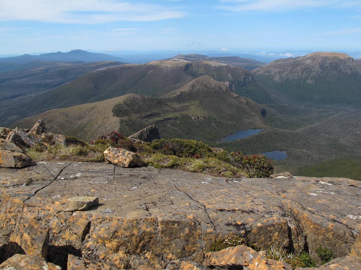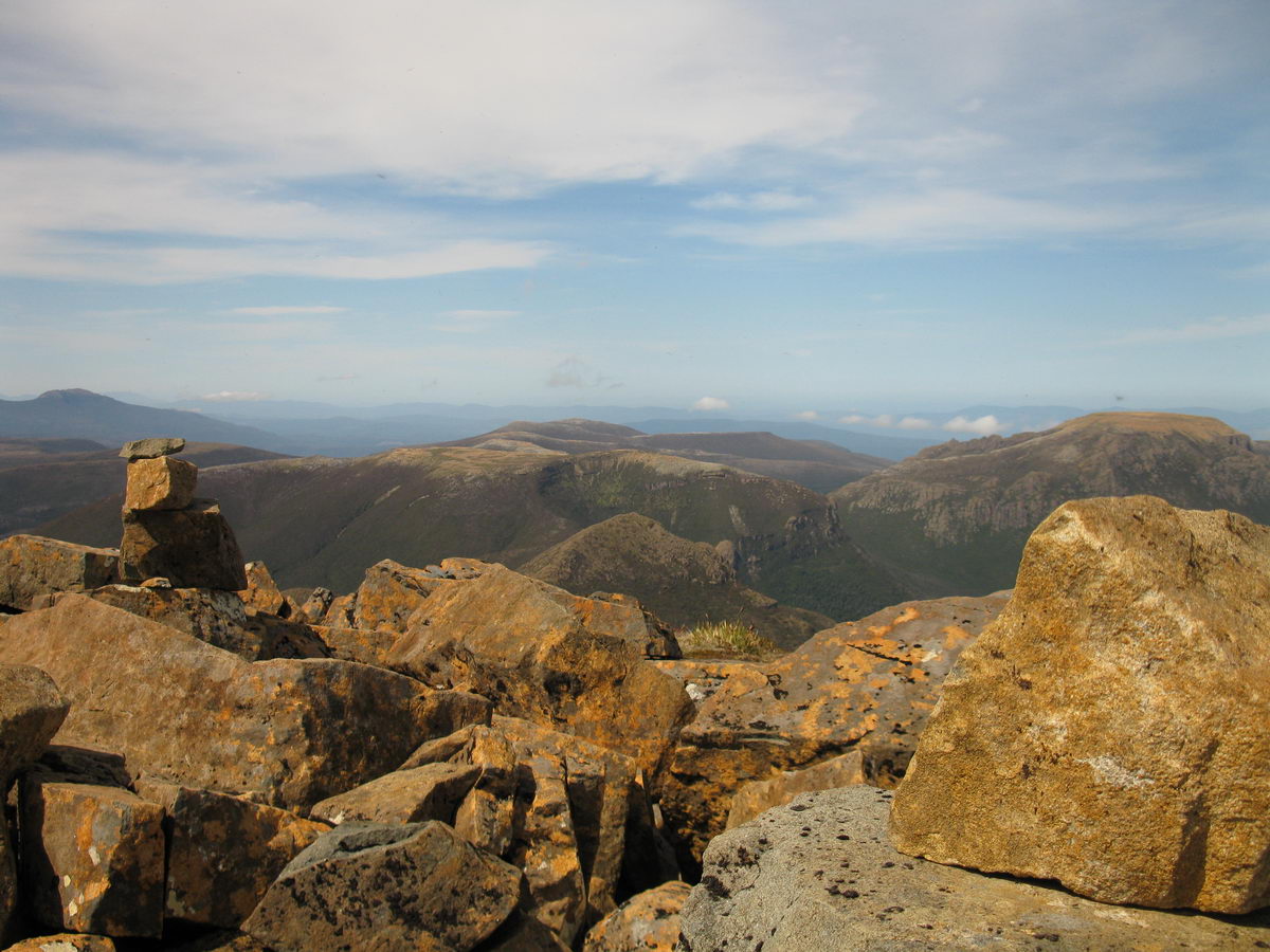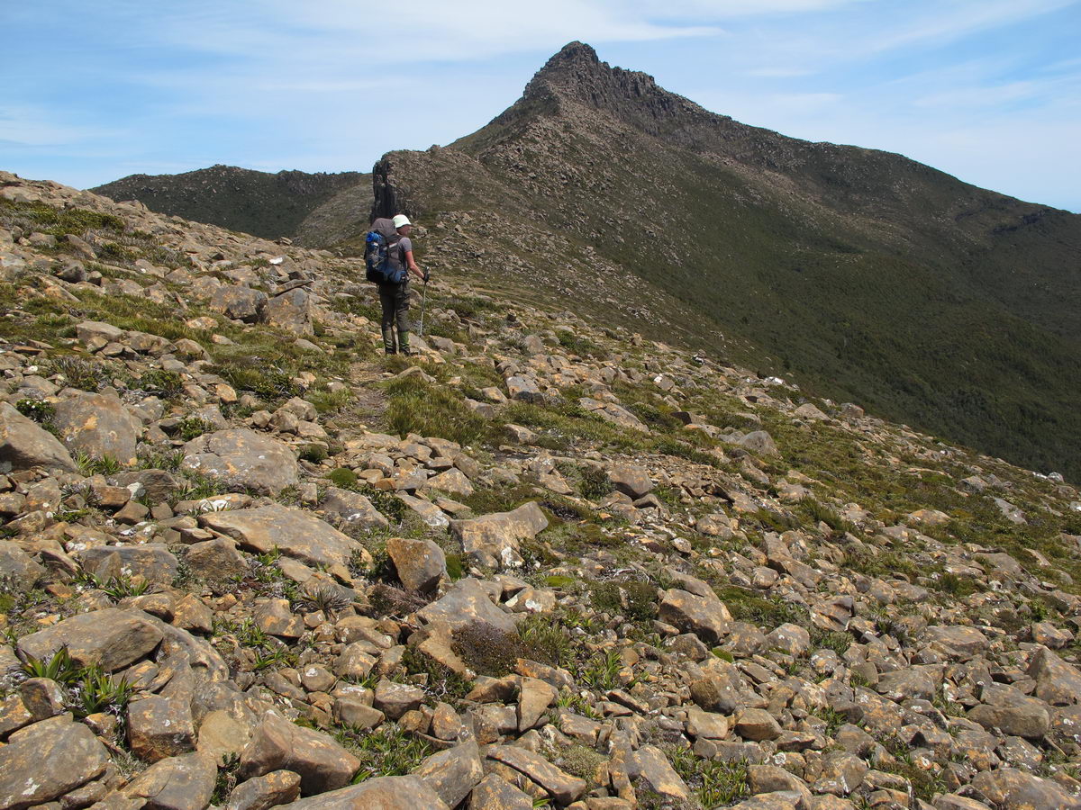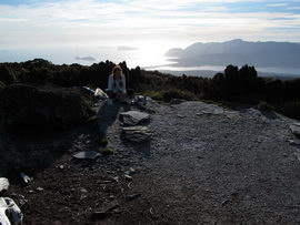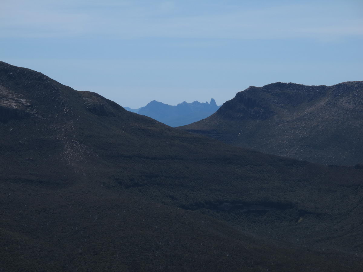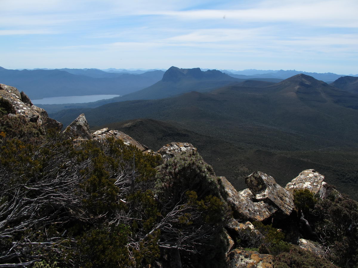 Susan's Diary: Hill One and Hill Two Saddle to Pandani Knob Tuesday 15 December 8:00 – 17:00 We got up at 6am for an 8am start. The wind was blowing quite strongly making for a cold morning, so we began in fleeces and beanies. We were hoping to make it to Leaning Tea Tree Saddle today, although not really expecting to, in order to give us a shot of making Precipitous Bluff before the expected rain for Thursday. The walk from Hill Two to Pigsty Ponds was fairly easy with spectacular views of everything – mountains and ocean. We arrived at Pigsty Ponds after 1.5 hours and ran into the son from the day before. As it turns out he re-injured himself the night before when they pushed to make camp at Pigsty Ponds. We had seen his and another tent from Hill Four and incredibly the owner of the other tent knew the son and told him of his attempt at Precipitous Bluff where he got lost for 1.5 hours in the vicinity of Leaning Tea Tree Saddle. He said he climbed a tree to get a bearing to follow back onto the ridge and then decided against continuing on. He warned us not to leave anything on the outside of our packs and to be very careful with the track in the coming days. From Pigsty Ponds there was a tiring climb up past an impressive stone arrow marking the Mt La Peruse turn-off. The track then continued onto Maxwell Ridge. Past this point the track climbs steadily to a rocky ridge, with excellent views over the landscape traversed the day before. On the ridge top we followed erect cairns for easy spectacular walking until we reached the ridge that descended onto King Billy Saddle. The ridge gave more excellent views of the area, in particular Ooze Lake and Pindars Peak, which for the first time was in complete view (the day before you just manage to see its peak). The descent was tiring through mud and narrow corrals. The day was heating up, in the 30s, and from King Billy Saddle to Ooze Lake we had to bash through reasonably dense scrub which had the advantage of providing respite from the sun. At Ooze Lake we stopped for lunch. Given the time was 13:40 when we finished, we didn’t think we would make it to Leaning Tea Tree Saddle so we had to stock up on water again (no reliable water before then), which was unfortunate. I found carrying a very heavy pack very tiring in the sun. Straight after Ooze Lake there is a steady gradual climb up to Pindars Peak, which starts off on the west side and then crosses over to the east side of the range which is sheltered from any potential breezes. This made the climb very long and unpleasant for me in the scorching heat. With much relief we reached the Pindars Peak ascent turn-off after a slow progress 1:20 hours. Given the excellent weather and with no pack, I found the energy to join Luca on the climb up to the top – and it was worth it as the views of the South Coast were excellent. The beaches on the South Coast track looked very inviting, and contrasted starkly to the rather dry and hot ranges we were on. Much “talk” was had about abandoning the ‘loop’ and cutting across to the coast – mostly by Luca, and only in jest. Tassie bush bashing is best left alone! The views from Pindars Peak spanned 360 degrees: also including the Arthurs, Mt Anne, Precipitous Bluff, New River Lagoon, the Southern Ranges, and more. Eventually we started descending off Pindars Peak, the heat of the day had lessened considerably by this stage, and a breeze occasionally picked up. The track stays pretty close to the cliff face on the west side until the cliffs peter out and you regain the ridge. Not long after we reached Pandani Knob we decided to call it a day. The campsite was very pretty, surrounded by sculpted scoparia, and there were some small pools of dodgy water, probably only suitable for cleaning (given they were on the track). We figured that the temperature must have been 30 degrees that day so we were a bit worried about how we would fair the next day, expected to be in the 30s again, where we would be scrub bashing for the whole day. We decided we should get a very early start and hoped there would be another cold and windy morning. The evening was glorious as we cooked outside with views of Precipitous Bluff and Federation Peak. We spoke about waiting for the sunset but given our impending early start - and fatigue - we decided to get an early night. The weather was warm and Luca was only in a T Shirt until 8pm. We even attempted to sleep with the fly open but the wind caused an annoying flapping sound, so it was closed sometime in the early hours of the morning. |