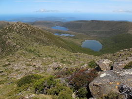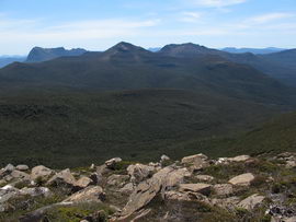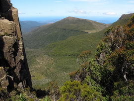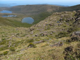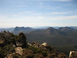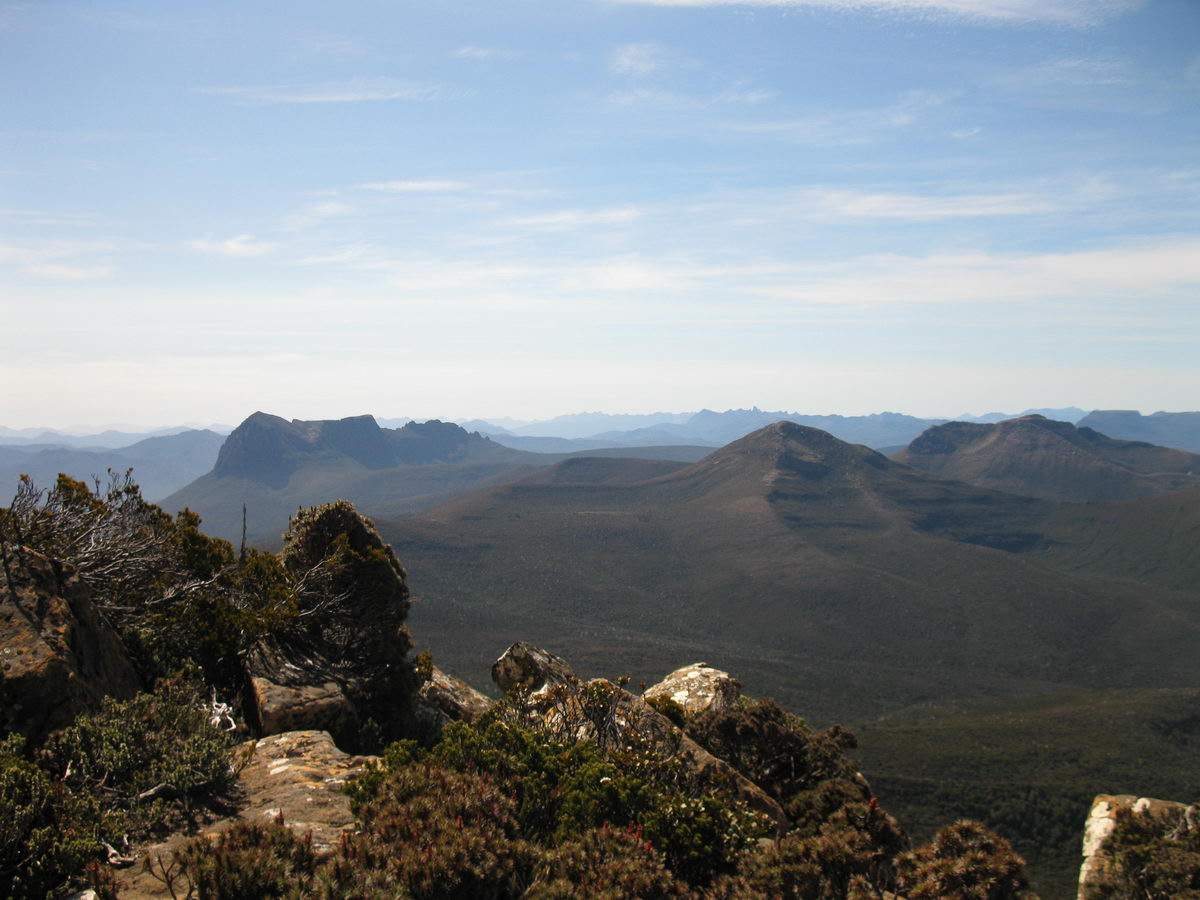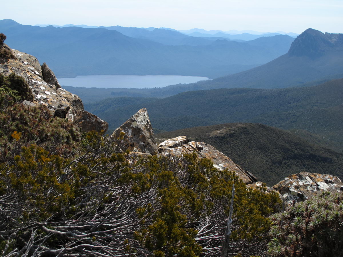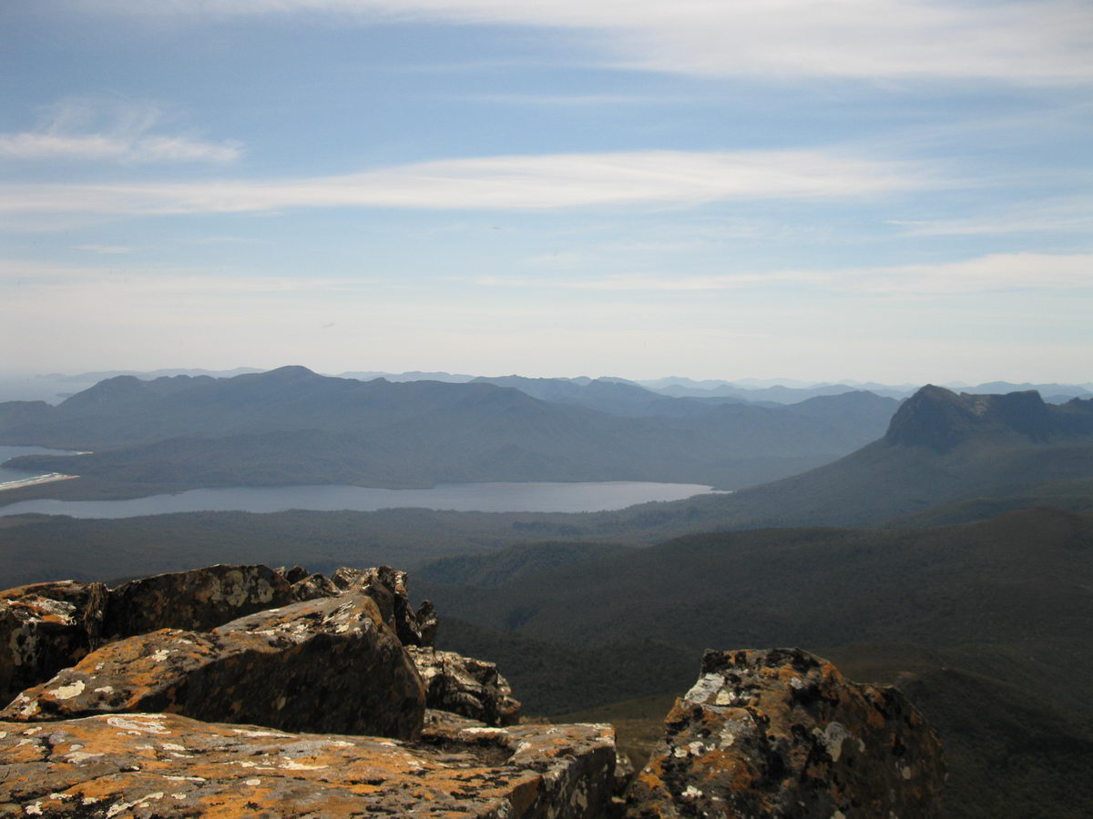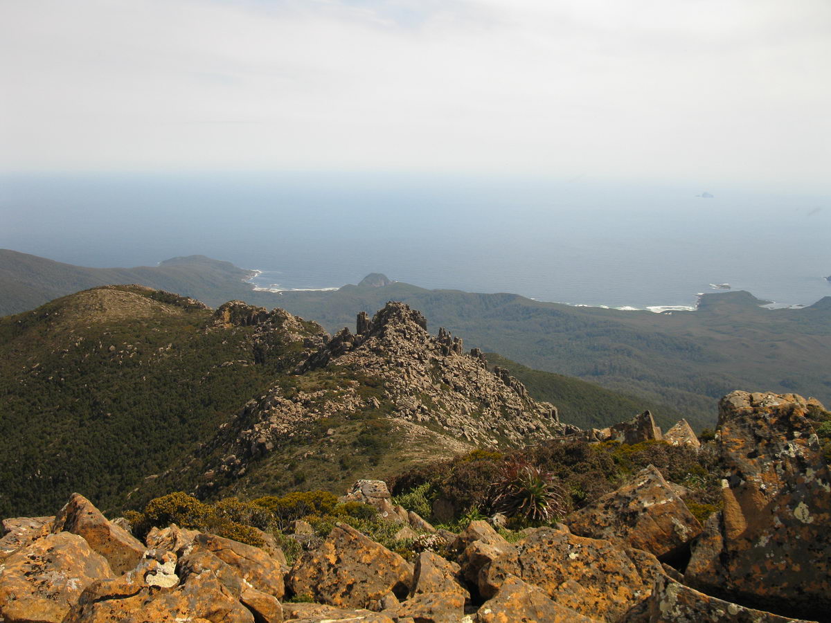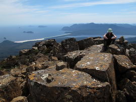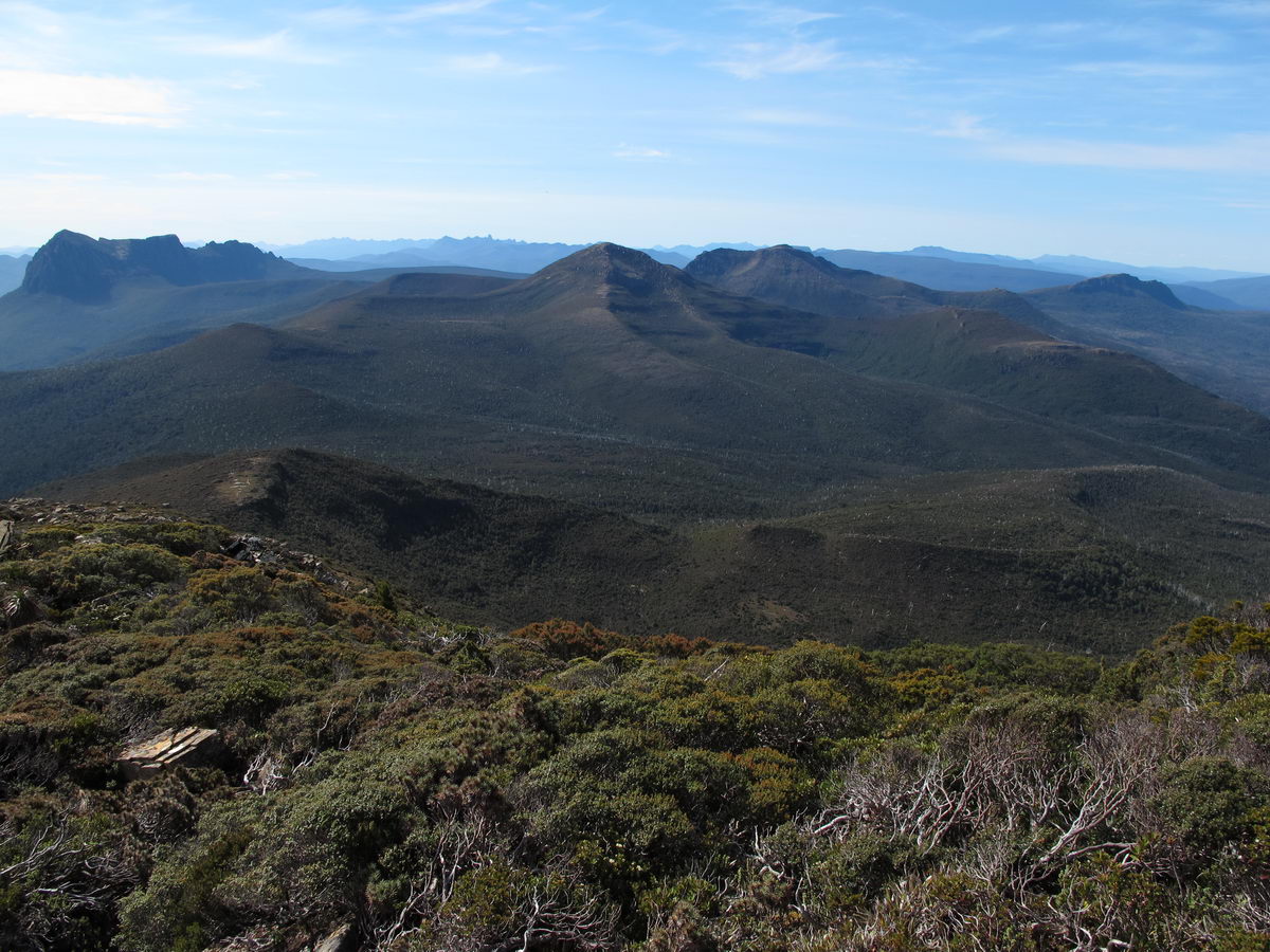 Susan's Diary: Hill One and Hill Two Saddle to Pandani Knob Tuesday 15 December 8:00 – 17:00 We got up at 6am for an 8am start. The wind was blowing quite strongly making for a cold morning, so we began in fleeces and beanies. We were hoping to make it to Leaning Tea Tree Saddle today, although not really expecting to, in order to give us a shot of making Precipitous Bluff before the expected rain for Thursday. The walk from Hill Two to Pigsty Ponds was fairly easy with spectacular views of everything – mountains and ocean. We arrived at Pigsty Ponds after 1.5 hours and ran into the son from the day before. As it turns out he re-injured himself the night before when they pushed to make camp at Pigsty Ponds. We had seen his and another tent from Hill Four and incredibly the owner of the other tent knew the son and told him of his attempt at Precipitous Bluff where he got lost for 1.5 hours in the vicinity of Leaning Tea Tree Saddle. He said he climbed a tree to get a bearing to follow back onto the ridge and then decided against continuing on. He warned us not to leave anything on the outside of our packs and to be very careful with the track in the coming days. From Pigsty Ponds there was a tiring climb up past an impressive stone arrow marking the Mt La Peruse turn-off. The track then continued onto Maxwell Ridge. Past this point the track climbs steadily to a rocky ridge, with excellent views over the landscape traversed the day before. On the ridge top we followed erect cairns for easy spectacular walking until we reached the ridge that descended onto King Billy Saddle. The ridge gave more excellent views of the area, in particular Ooze Lake and Pindars Peak, which for the first time was in complete view (the day before you just manage to see its peak). The descent was tiring through mud and narrow corrals. The day was heating up, in the 30s, and from King Billy Saddle to Ooze Lake we had to bash through reasonably dense scrub which had the advantage of providing respite from the sun. At Ooze Lake we stopped for lunch. Given the time was 13:40 when we finished, we didn’t think we would make it to Leaning Tea Tree Saddle so we had to stock up on water again (no reliable water before then), which was unfortunate. I found carrying a very heavy pack very tiring in the sun. Straight after Ooze Lake there is a steady gradual climb up to Pindars Peak, which starts off on the west side and then crosses over to the east side of the range which is sheltered from any potential breezes. This made the climb very long and unpleasant for me in the scorching heat. With much relief we reached the Pindars Peak ascent turn-off after a slow progress 1:20 hours. Given the excellent weather and with no pack, I found the energy to join Luca on the climb up to the top – and it was worth it as the views of the South Coast were excellent. The beaches on the South Coast track looked very inviting, and contrasted starkly to the rather dry and hot ranges we were on. Much “talk” was had about abandoning the ‘loop’ and cutting across to the coast – mostly by Luca, and only in jest. Tassie bush bashing is best left alone! The views from Pindars Peak spanned 360 degrees: also including the Arthurs, Mt Anne, Precipitous Bluff, New River Lagoon, the Southern Ranges, and more. Eventually we started descending off Pindars Peak, the heat of the day had lessened considerably by this stage, and a breeze occasionally picked up. The track stays pretty close to the cliff face on the west side until the cliffs peter out and you regain the ridge. Not long after we reached Pandani Knob we decided to call it a day. The campsite was very pretty, surrounded by sculpted scoparia, and there were some small pools of dodgy water, probably only suitable for cleaning (given they were on the track). We figured that the temperature must have been 30 degrees that day so we were a bit worried about how we would fair the next day, expected to be in the 30s again, where we would be scrub bashing for the whole day. We decided we should get a very early start and hoped there would be another cold and windy morning. The evening was glorious as we cooked outside with views of Precipitous Bluff and Federation Peak. We spoke about waiting for the sunset but given our impending early start - and fatigue - we decided to get an early night. The weather was warm and Luca was only in a T Shirt until 8pm. We even attempted to sleep with the fly open but the wind caused an annoying flapping sound, so it was closed sometime in the early hours of the morning. |
