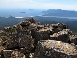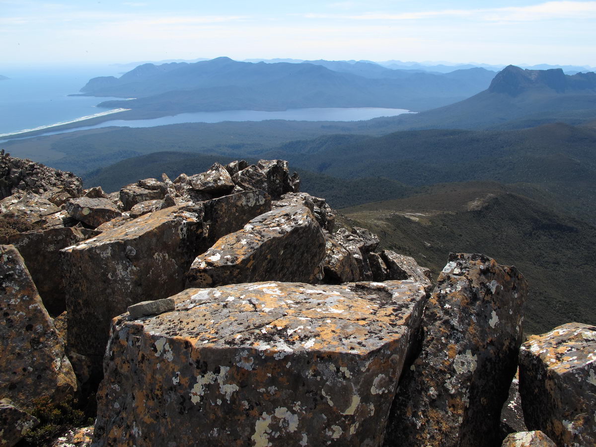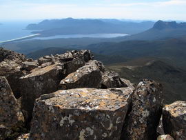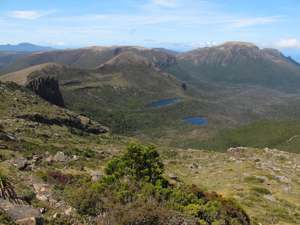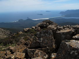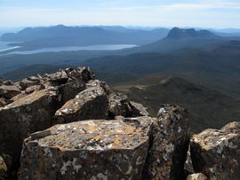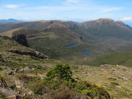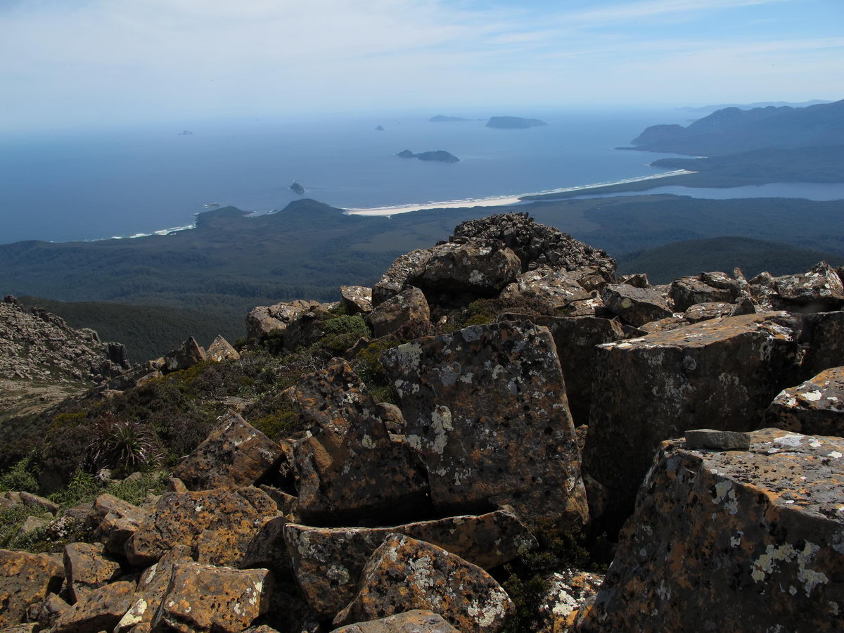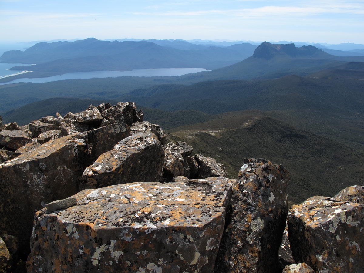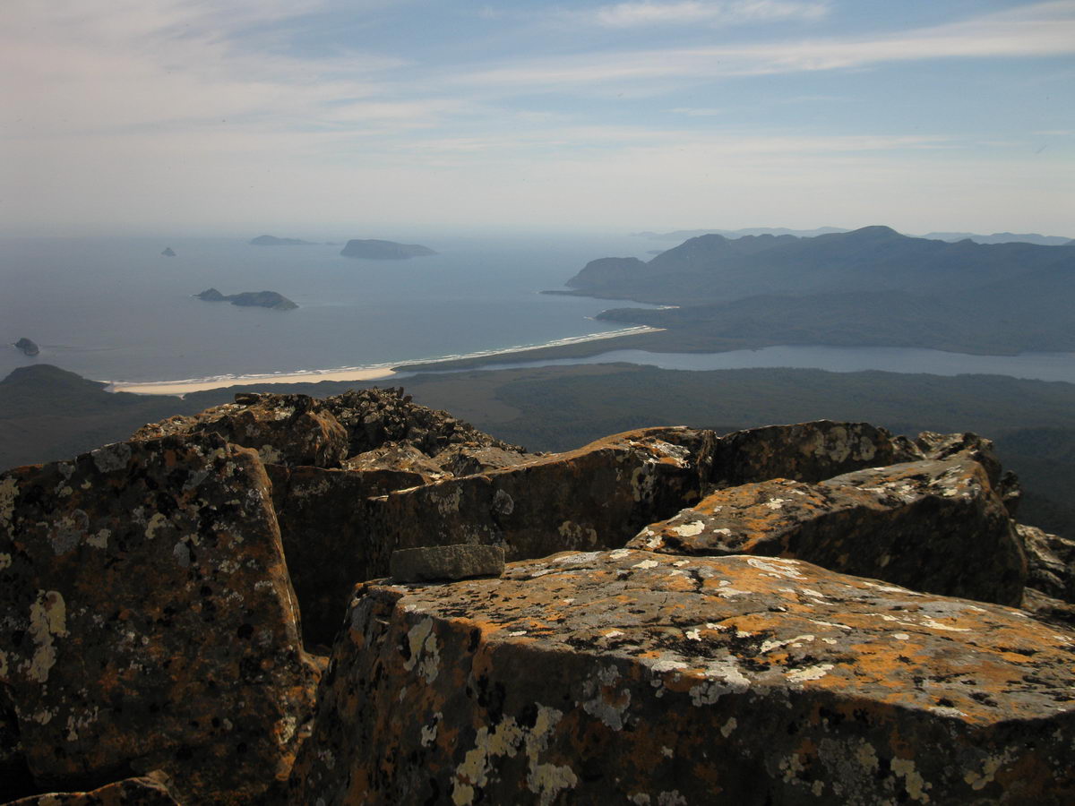 Susan's Diary: Hill One and Hill Two Saddle to Pandani Knob Tuesday 15 December 8:00 – 17:00 We got up at 6am for an 8am start. The wind was blowing quite strongly making for a cold morning, so we began in fleeces and beanies. We were hoping to make it to Leaning Tea Tree Saddle today, although not really expecting to, in order to give us a shot of making Precipitous Bluff before the expected rain for Thursday. The walk from Hill Two to Pigsty Ponds was fairly easy with spectacular views of everything – mountains and ocean. We arrived at Pigsty Ponds after 1.5 hours and ran into the son from the day before. As it turns out he re-injured himself the night before when they pushed to make camp at Pigsty Ponds. We had seen his and another tent from Hill Four and incredibly the owner of the other tent knew the son and told him of his attempt at Precipitous Bluff where he got lost for 1.5 hours in the vicinity of Leaning Tea Tree Saddle. He said he climbed a tree to get a bearing to follow back onto the ridge and then decided against continuing on. He warned us not to leave anything on the outside of our packs and to be very careful with the track in the coming days. From Pigsty Ponds there was a tiring climb up past an impressive stone arrow marking the Mt La Peruse turn-off. The track then continued onto Maxwell Ridge. Past this point the track climbs steadily to a rocky ridge, with excellent views over the landscape traversed the day before. On the ridge top we followed erect cairns for easy spectacular walking until we reached the ridge that descended onto King Billy Saddle. The ridge gave more excellent views of the area, in particular Ooze Lake and Pindars Peak, which for the first time was in complete view (the day before you just manage to see its peak). The descent was tiring through mud and narrow corrals. The day was heating up, in the 30s, and from King Billy Saddle to Ooze Lake we had to bash through reasonably dense scrub which had the advantage of providing respite from the sun. At Ooze Lake we stopped for lunch. Given the time was 13:40 when we finished, we didn’t think we would make it to Leaning Tea Tree Saddle so we had to stock up on water again (no reliable water before then), which was unfortunate. I found carrying a very heavy pack very tiring in the sun. Straight after Ooze Lake there is a steady gradual climb up to Pindars Peak, which starts off on the west side and then crosses over to the east side of the range which is sheltered from any potential breezes. This made the climb very long and unpleasant for me in the scorching heat. With much relief we reached the Pindars Peak ascent turn-off after a slow progress 1:20 hours. Given the excellent weather and with no pack, I found the energy to join Luca on the climb up to the top – and it was worth it as the views of the South Coast were excellent. The beaches on the South Coast track looked very inviting, and contrasted starkly to the rather dry and hot ranges we were on. Much “talk” was had about abandoning the ‘loop’ and cutting across to the coast – mostly by Luca, and only in jest. Tassie bush bashing is best left alone! The views from Pindars Peak spanned 360 degrees: also including the Arthurs, Mt Anne, Precipitous Bluff, New River Lagoon, the Southern Ranges, and more. Eventually we started descending off Pindars Peak, the heat of the day had lessened considerably by this stage, and a breeze occasionally picked up. The track stays pretty close to the cliff face on the west side until the cliffs peter out and you regain the ridge. Not long after we reached Pandani Knob we decided to call it a day. The campsite was very pretty, surrounded by sculpted scoparia, and there were some small pools of dodgy water, probably only suitable for cleaning (given they were on the track). We figured that the temperature must have been 30 degrees that day so we were a bit worried about how we would fair the next day, expected to be in the 30s again, where we would be scrub bashing for the whole day. We decided we should get a very early start and hoped there would be another cold and windy morning. The evening was glorious as we cooked outside with views of Precipitous Bluff and Federation Peak. We spoke about waiting for the sunset but given our impending early start - and fatigue - we decided to get an early night. The weather was warm and Luca was only in a T Shirt until 8pm. We even attempted to sleep with the fly open but the wind caused an annoying flapping sound, so it was closed sometime in the early hours of the morning. |