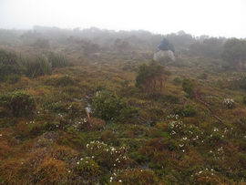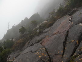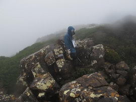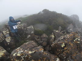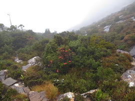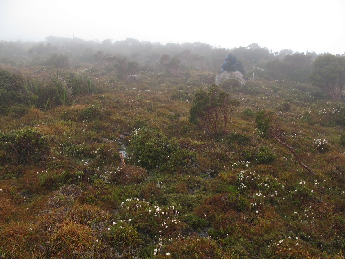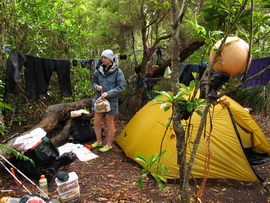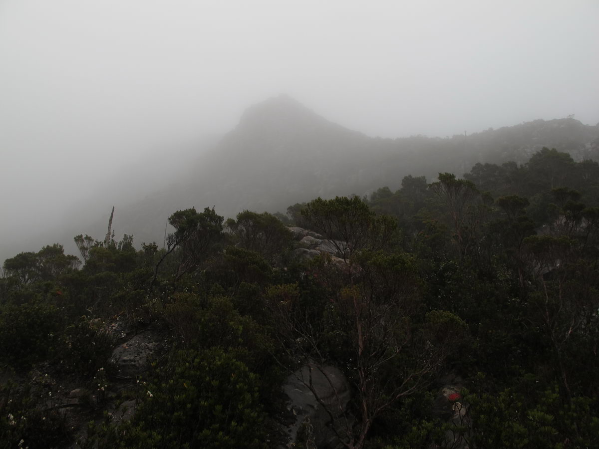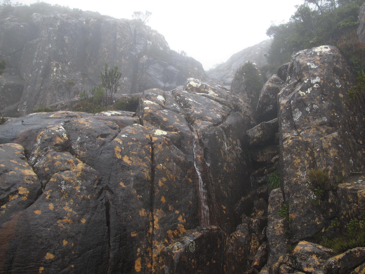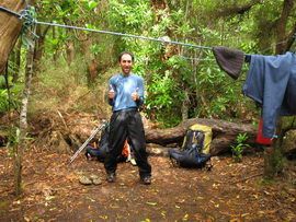 Susan's Diary: Tramp Camp to Cavern Camp Thursday 17 December 7:30 – 18:30 After listening to the rain on and off throughout the night, we slept in for another 30 minutes as the sound of rain was a big disincentive to pack and start the walk. We packed up the wet tent last and were on our way at 7:30am (took 2 hours to get going…not unusual for us). The walk started with a broad climb and descent on Kameruka Morraine, which Luca and I agree rated in the top 3 of the most unpleasant sections of the walk, as the annoying scrub was interspersed with annoying rock scrambling. We did pass some false leads as well, but found our way through without any trouble. All in all, it was a relief that we didn’t attempt this section at the end of the previous day. The weather continued to drizzle and there were no views – Precipitous Bluff was felt but not seen. After about an hour the track improved as we reached the highest point on the moraine and the walking became easier. An hour later the track started winding around a bit, with what appeared to be more false leads, and to my surprise, we started climbing in a westerly direction. This seemingly contrasted to the map where from the highest point of the moraine we needed to descend broadly. My concerns were that we may have been on a false lead and I did not want to waste energy climbing in the wrong direction. Possibly, the confusion was caused by the false leads we had come across (but clearly avoided) and the very little visibility didn’t allow us any reference points. We could hazard a guess and say that with good visibility the general direction of the walk would be obvious (given PB’s presumed presence in front of us - although this is a guess). It should be said that despite the few false leads here and there, the track we were on was obvious, and occasionally even had markers. The gloomy threatening weather probably caused more ‘anxiety’ that was strictly necessary! We checked the GPS and it appeared that we had begun to ascend Precipitous Bluff. It also appeared that we had completely walked past Low Camp, or at least it was higher on the side of Precipitous Bluff than we had anticipated. We scrambled up Precipitous Bluff some more, passing a number of small waterfalls, no doubt flowing particularly well after the rain. It became clear that we had indeed missed Low Camp and that we had well and truly started the ascent to the top of PB. The ascent is impressive, with very minor rock scrambling, spectacular cliff walls, great views east, and, on the whole, an easy way up what seems from below to be impenetrable. Soon after the scrambling we reached what appears to be a beautiful broad gully that effectively gives you a picturesque ramp all the way to the saddle at the top. In this gully there is a botanical gardens-style constructed track! We soon passed what appeared to be some very wet campsites and some rocky, sloping campsites, so we figured we were at Plateau Camp. We dumped our packs and headed off along the ridge to the summit. Given the weather we obviously wouldn’t be getting any views, but at least it’d give us an opportunity to read the log book. It also gave us a rest from carrying our packs. As we headed up the ridge crest we noticed that on the right of the ridge there appeared to be a rather precipitous drop – a look over confirmed this, so we stuck to the left side! Not long after we started Luca thought we had reached the summit – as we were on the highest point we could see. I assured him I had seen a higher point earlier so we went and found the summit track and continued on. Through the mist we had some glimpses of very impressive rock walls which did look very precipitous. While the walk to the summit was very easy there certainly is a lot of exposure to heights if you want to get close to some of the edges (or you could steer completely away from them!). Unfortunately, due to our cameras fogging up in the wet weather we weren’t able to capture much of the views that we had through the mist. At the summit we took a few hurried photos and quickly signed the log book for fear of it getting wet. We were the first people on the summit in about 1 month. There was another canister up there that was wet containing some soggy Chapman notes of the walk. I guess the previous owner didn’t need them to get back? After getting back to our packs we had a snack and contemplated the 4-6 hours ahead to Cavern Camp. The scrambling off the west side of Precipitous Bluff ended all too soon and we were faced with very annoying sidling of Precipitous Bluff. The scrambling is not particularly difficult, nor overly exposed, but did require some care. The highlight for us occurred when the mist/fog lifted and we got some amazing glimpses of the cliffs of Precipitous Bluff. It’s a very impressive mountain and despite the difficulties getting there (from either side) it is certainly worth it in our opinions! We can only imagine how it would look on a clear day. We were lucky enough at one point that the clouds shifted and we could see glimpses of New River Lagoon. It did look a long way away. We continued on along the cliffs, seeing some very pretty small waterfalls along the way. We were, however, happy to finally begin the descent. The sidling we had done up to this point was typical sidling, continuous little scrambles up and down, seemingly not making much progress. Although, again, the lack of visibility probably exacerbated this feeling. The descent had lots of colourful markers to follow and it felt like we dropped height pretty quickly. The markers did go missing often enough, however, so we had to concentrate not to lose the track. This was not an easy track to follow (at least on this occasion), as the vegetation is somewhat tropical, very wet and rotten, with uneven muddy and loose terrain underfoot. At about vertical 250 metres above the lagoon, the track stopped descending so we negotiated a ridge and av