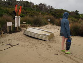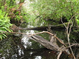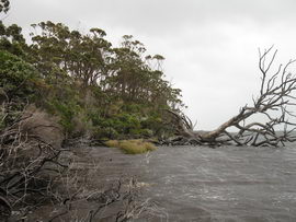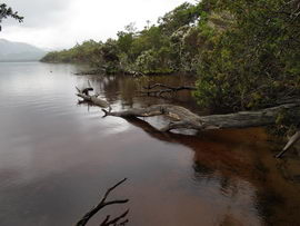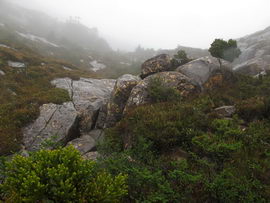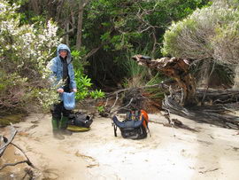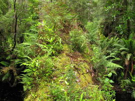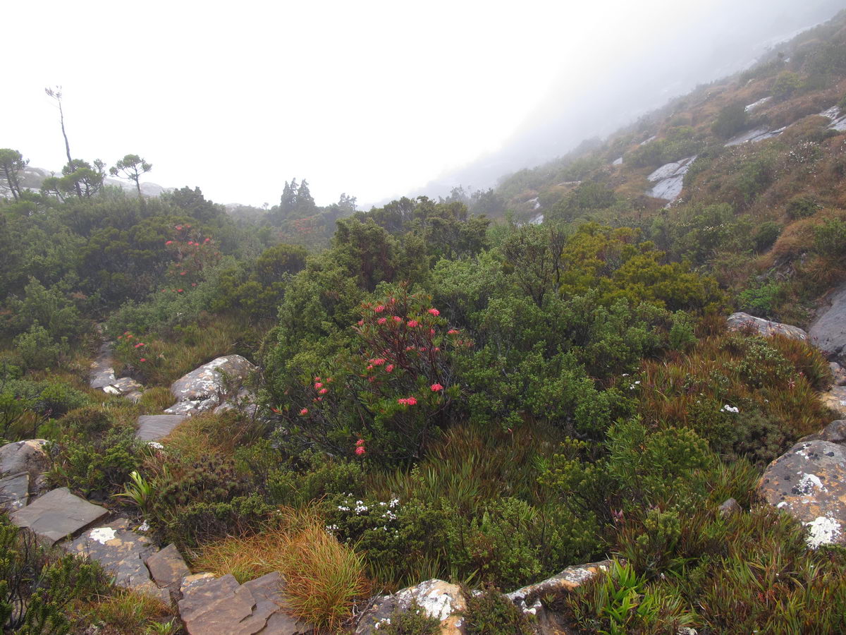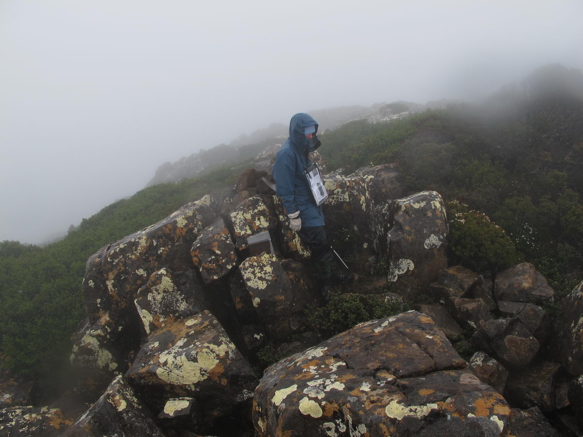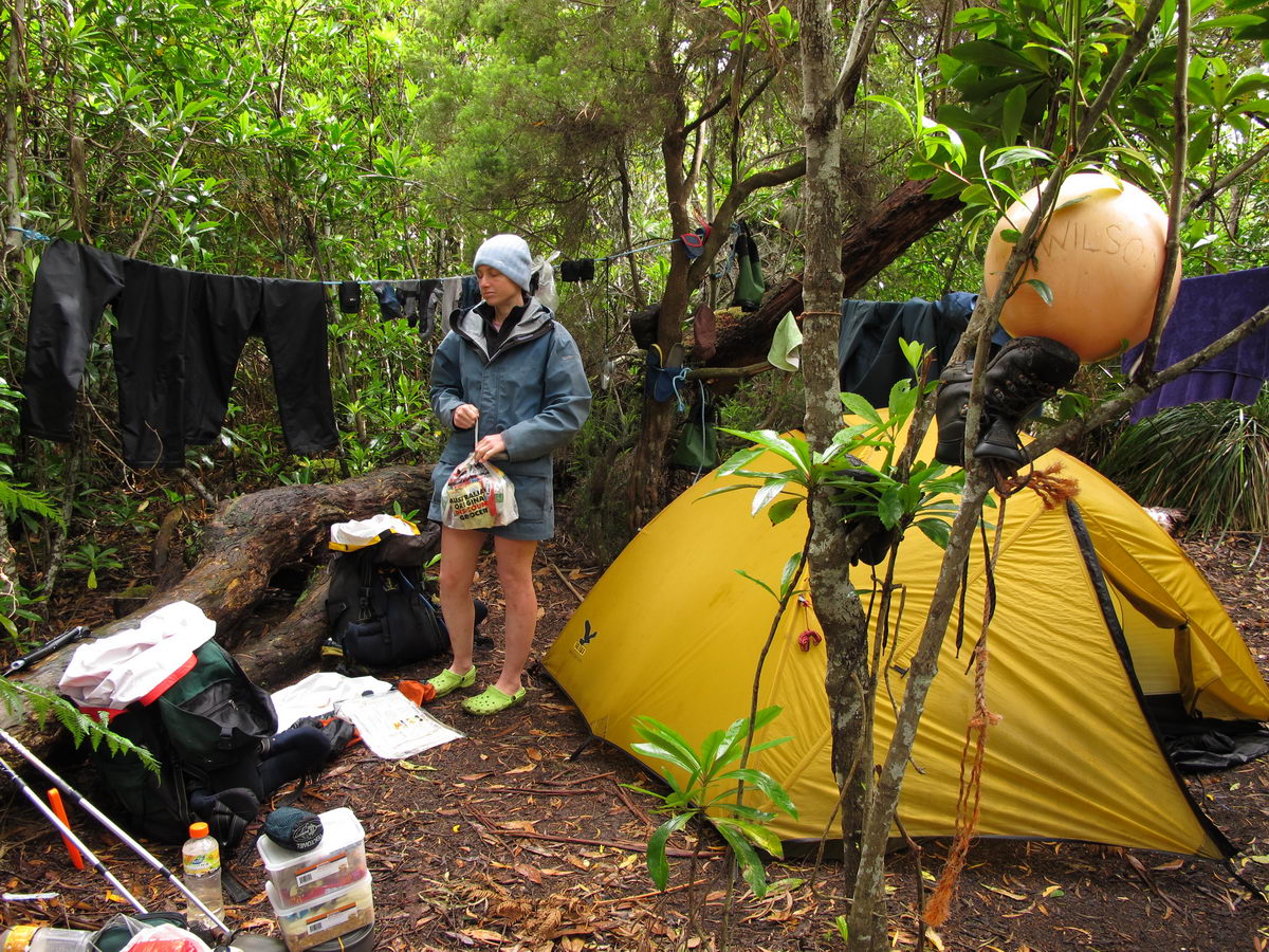Susan's Diary: Tramp Camp to Cavern Camp Thursday 17 December 7:30 – 18:30 After listening to the rain on and off throughout the night, we slept in for another 30 minutes as the sound of rain was a big disincentive to pack and start the walk. We packed up the wet tent last and were on our way at 7:30am (took 2 hours to get going…not unusual for us). The walk started with a broad climb and descent on Kameruka Morraine, which Luca and I agree rated in the top 3 of the most unpleasant sections of the walk, as the annoying scrub was interspersed with annoying rock scrambling. We did pass some false leads as well, but found our way through without any trouble. All in all, it was a relief that we didn’t attempt this section at the end of the previous day. The weather continued to drizzle and there were no views – Precipitous Bluff was felt but not seen. After about an hour the track improved as we reached the highest point on the moraine and the walking became easier. An hour later the track started winding around a bit, with what appeared to be more false leads, and to my surprise, we started climbing in a westerly direction. This seemingly contrasted to the map where from the highest point of the moraine we needed to descend broadly. My concerns were that we may have been on a false lead and I did not want to waste energy climbing in the wrong direction. Possibly, the confusion was caused by the false leads we had come across (but clearly avoided) and the very little visibility didn’t allow us any reference points. We could hazard a guess and say that with good visibility the general direction of the walk would be obvious (given PB’s presumed presence in front of us - although this is a guess). It should be said that despite the few false leads here and there, the track we were on was obvious, and occasionally even had markers. The gloomy threatening weather probably caused more ‘anxiety’ that was strictly necessary! We checked the GPS and it appeared that we had begun to ascend Precipitous Bluff. It also appeared that we had completely walked past Low Camp, or at least it was higher on the side of Precipitous Bluff than we had anticipated. We scrambled up Precipitous Bluff some more, passing a number of small waterfalls, no doubt flowing particularly well after the rain. It became clear that we had indeed missed Low Camp and that we had well and truly started the ascent to the top of PB. The ascent is impressive, with very minor rock scrambling, spectacular cliff walls, great views east, and, on the whole, an easy way up what seems from below to be impenetrable. Soon after the scrambling we reached what appears to be a beautiful broad gully that effectively gives you a picturesque ramp all the way to the saddle at the top. In this gully there is a botanical gardens-style constructed track! We soon passed what appeared to be some very wet campsites and some rocky, sloping campsites, so we figured we were at Plateau Camp. We dumped our packs and headed off along the ridge to the summit. Given the weather we obviously wouldn’t be getting any views, but at least it’d give us an opportunity to read the log book. It also gave us a rest from carrying our packs. As we headed up the ridge crest we noticed that on the right of the ridge there appeared to be a rather precipitous drop – a look over confirmed this, so we stuck to the left side! Not long after we started Luca thought we had reached the summit – as we were on the highest point we could see. I assured him I had seen a higher point earlier so we went and found the summit track and continued on. Through the mist we had some glimpses of very impressive rock walls which did look very precipitous. While the walk to the summit was very easy there certainly is a lot of exposure to heights if you want to get close to some of the edges (or you could steer completely away from them!). Unfortunately, due to our cameras fogging up in the wet weather we weren’t able to capture much of the views that we had through the mist. At the summit we took a few hurried photos and quickly signed the log book for fear of it getting wet. We were the first people on the summit in about 1 month. There was another canister up there that was wet containing some soggy Chapman notes of the walk. I guess the previous owner didn’t need them to get back? After getting back to our packs we had a snack and contemplated the 4-6 hours ahead to Cavern Camp. The scrambling off the west side of Precipitous Bluff ended all too soon and we were faced with very annoying sidling of Precipitous Bluff. The scrambling is not particularly difficult, nor overly exposed, but did require some care. The highlight for us occurred when the mist/fog lifted and we got some amazing glimpses of the cliffs of Precipitous Bluff. It’s a very impressive mountain and despite the difficulties getting there (from either side) it is certainly worth it in our opinions! We can only imagine how it would look on a clear day. We were lucky enough at one point that the clouds shifted and we could see glimpses of New River Lagoon. It did look a long way away. We continued on along the cliffs, seeing some very pretty small waterfalls along the way. We were, however, happy to finally begin the descent. The sidling we had done up to this point was typical sidling, continuous little scrambles up and down, seemingly not making much progress. Although, again, the lack of visibility probably exacerbated this feeling. The descent had lots of colourful markers to follow and it felt like we dropped height pretty quickly. The markers did go missing often enough, however, so we had to concentrate not to lose the track. This was not an easy track to follow (at least on this occasion), as the vegetation is somewhat tropical, very wet and rotten, with uneven muddy and loose terrain underfoot. At about vertical 250 metres above the lagoon, the track stopped descending so we negotiated a ridge and av