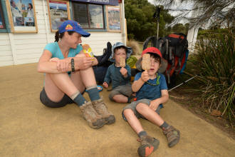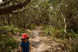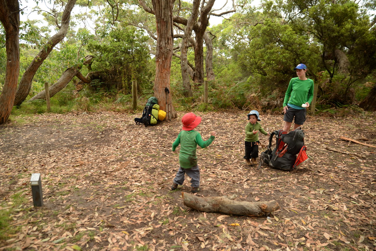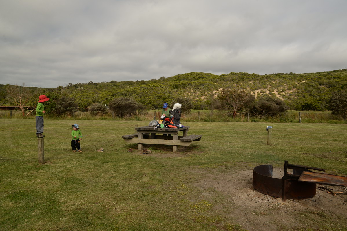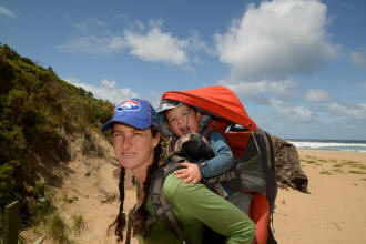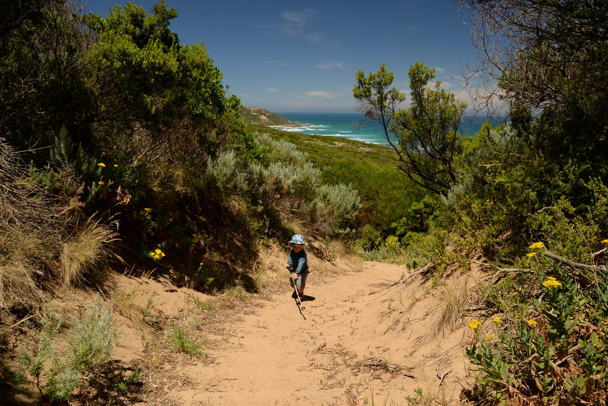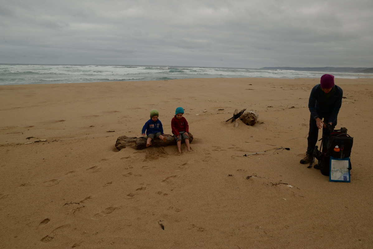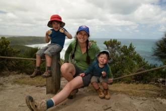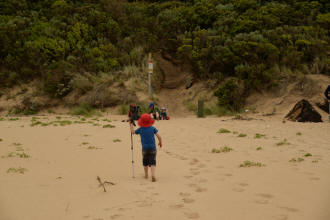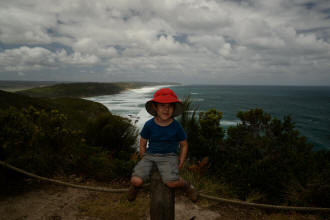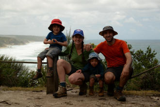 playground. We spotted many koalas during our stay here. Day 5 was a great rest day. We walked to the nearby Glenaire Beach and then attempted to walk back to camp by walking up the Aire River, until this became too difficult and we returned to the track close by. We searched out the local koalas and also toasted our half melted marshmallows. Day 6 was a hot day walking to Cape Otway with the track remaining high above the beach. Even the sandy track was hot! So after 7.5 kms and only 2.5 kms to our next camp it was decided that the boys needed a rest. So Luca went ahead and dropped off his pack and returned ready to carry our eldest Marcus the last bit of the walk. I entertained the kids by adding straw to their hats to keep away flies. By the time Luca was back Marcus was rested and walked to camp unaided. At the Cape Otway camp everyone had turns wearing the latest in eyewear, that someone had left behind. Day 7 was the walk to Parker Hill. To do this we went past the Otway Lighthouse where we stopped so we could all have an ice-cream. A reward to the boys for their great efforts. It was a warm day so when we reached Crayfish Bay we took a break. This was the nicest swimming spot on the whole walk. The remaining walk to Parker Hill was easy. After setting up we walked down to Parker Inlet which was beautiful and had a nice creek flowing across the beach to the sea that was safe for swimming. The water was still too cold for Luca and I. Luca went out at sunset to take his last sunset photos. Day 8 was a quick walk back to Blanket Bay and the car. Camera batteries are now low, so photography must take a back seat for the last day. Thanks to Nana and Grandpa for the car shuffle, Uncle Mike and Nat for their company and farmer Brian for his hospitality. Susan |