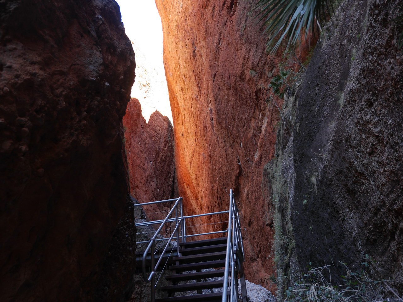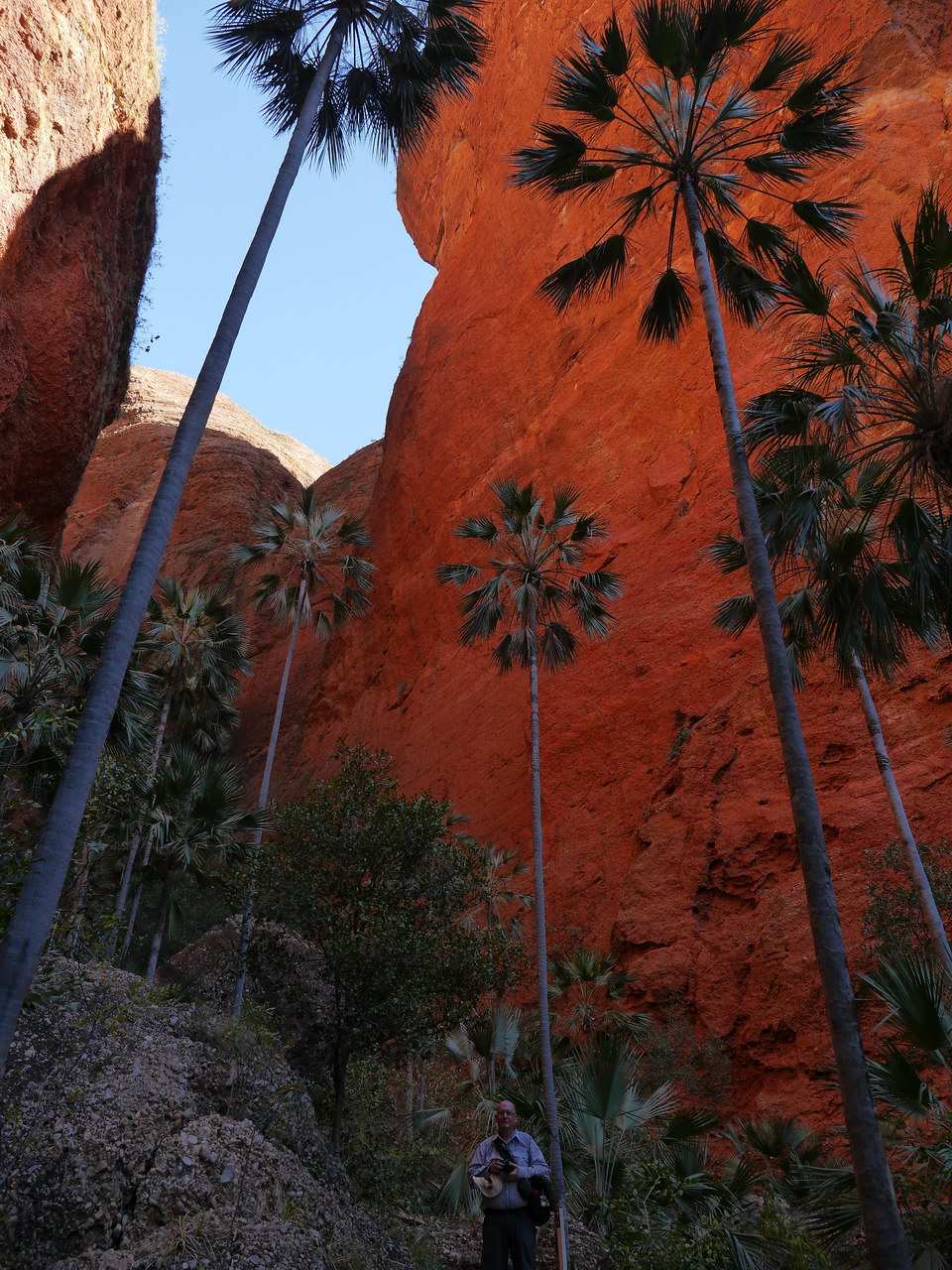 Notes: After lunch on Day 2 we went for the Mini Palms walk taking the side trip to Bloodwoods Lookout which is on the way. It was quite easy and quick to reach the lookout which gave views of the range and valley floor. Back out to our real walking track, we headed towards the cliffs. We walked along the creek bed for a while before we climbed into a valley proper. Here we were challenged with some boulder hopping before we reached the palm lined chasm. With the sun above the chasm walls they light up with a bright orange glow, a sight to behold. Then its back down the track to the carpark and then onto the campground. |