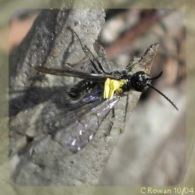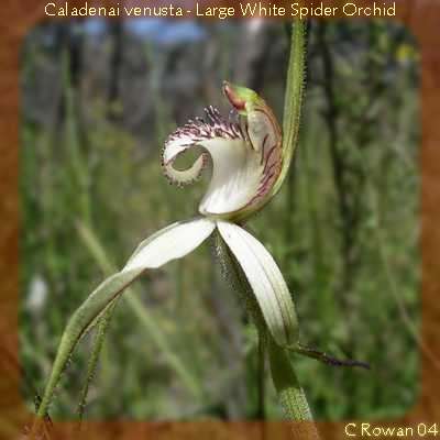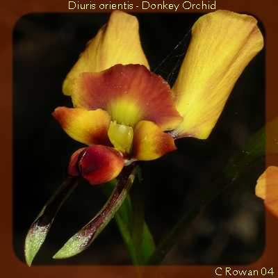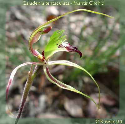 Cardiochila). The photo (right) shows a small spider crawling over the orchid. We often noticed that when the photo's we take are blown up on a computer screen, fine spider webs appear that were invisible when we were trying to take the photos. We knew the reason for the webs and it was good to see the action in progress as we photographed the orchid. Within a 100m we found our second orchid, the Mantis Orchid (Caladenia tentaculata) and soon our third, the very noticeable Donkey Orchid (Diuris Orientis). With nothing new coming our way we went off to seek a new area! |