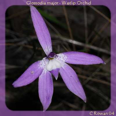include this in our count - NO! was the joint chorus. We were happy to see another Bearded Greenhood and took a couple of token photographs. We were surprised when we looked on the computer to see that it was yet another new greenhood - the Bearded Greenhood (Pterostylis plumosa). Further on the Waxlip Orchid presented itself (Glossodia major) We took a moment to count up our finds - how many were there now? 13..14 perhaps 15! Well lots anyway.