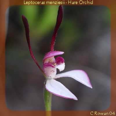 | The Anglesea Area was one that I never really thought of as an area abundant in orchids but on a sunny October day a few of us went on an expedition to find the elusive "Hare Orchid". It had been indicated that the orchid in question was out along the Pt Addis walk and, in fact, there were at least 12 different types of orchid flowering. Another reason for the expedition was to prove our expertise by bettering the 12 mark and create a personal best; perhaps a record of sorts. So what did we find - count on: | |
