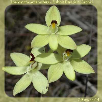 results. Rabbit Ears (Thelymitra antenifera) - is this because the lower left flower has that brown rabbit ears effect - possible? The others were the Salmon and Spotted Sun Orchids ( Thelymitra ruba & ixiodes). |
