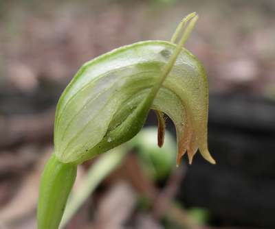 This greenhood is a cross between the Nodding Greenhood (Pterostylis